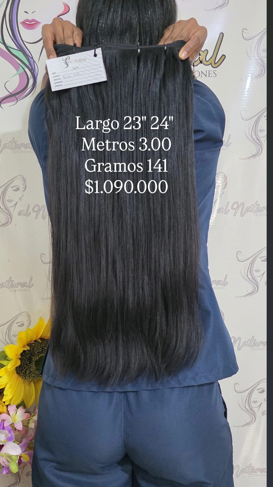 Extensión de cabello Liso  , de 23-24 pulgadas de longitud, Cantidad 3,00 Metros Y Pesa 141 Gramos.