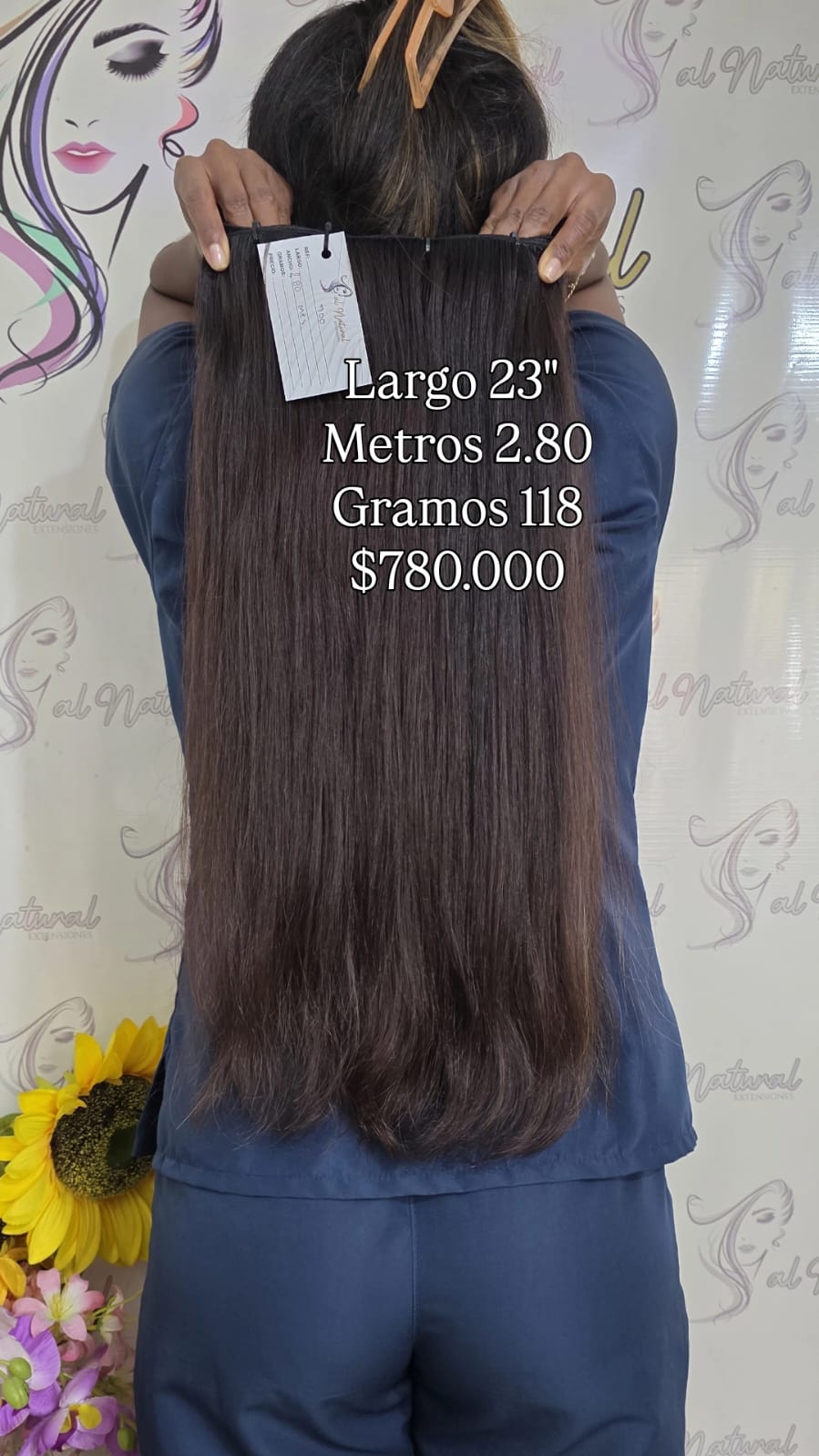 Extensión de cabello Liso , de 23 pulgadas de longitud, Cantidad 2,80 Metros Y Pesa 118 Gramos.